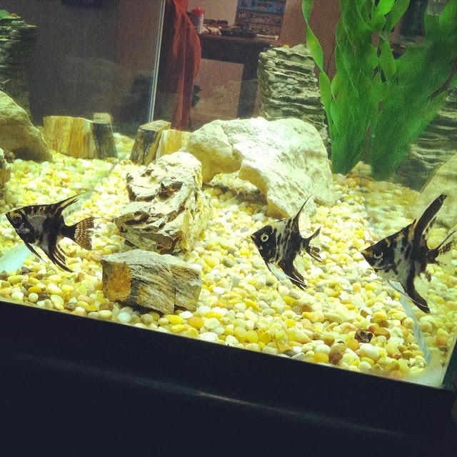 So now that we've been back in California for 6 months, I decided to fill up my aquarium again. I spent a month preparing, cycling my tank, doing water tests and changes as needed to get things just right. Then I brought home three BEAUTIFUL little angels to live in my tank happily together.